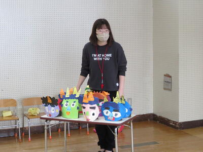 担任がお面の紹介をしました。どんなところを工夫したか説明しました。みんなとても立派なお面ができました。