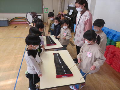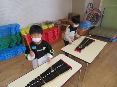 年長さんがいろいろな楽器をつかって園歌を演奏しているところに、年少さんたちも混ぜてもらいました。