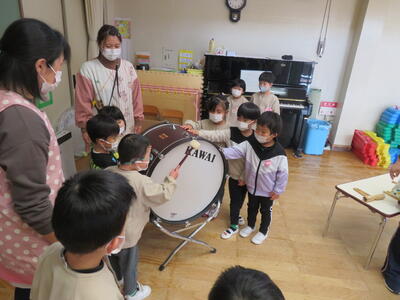 年長さんから、各々の楽器の名前や音の出し方を教わりました。