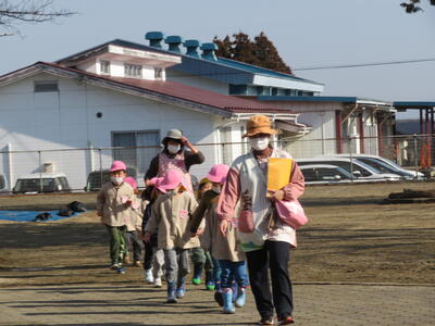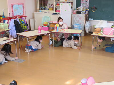 地震を想定した避難訓練を実施しました。年長さんは遊戯室で、年少さんは園庭で遊んでいました。