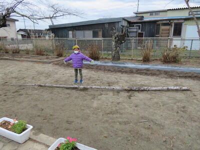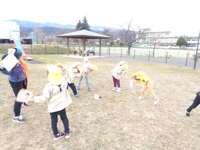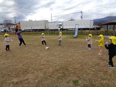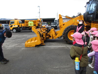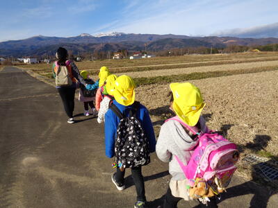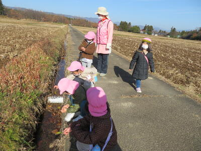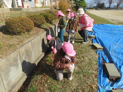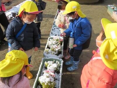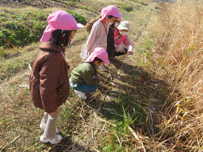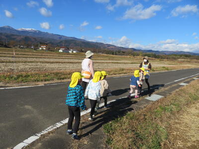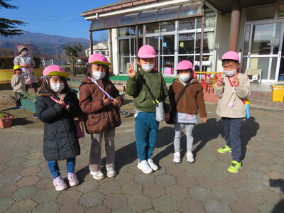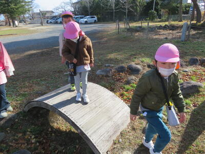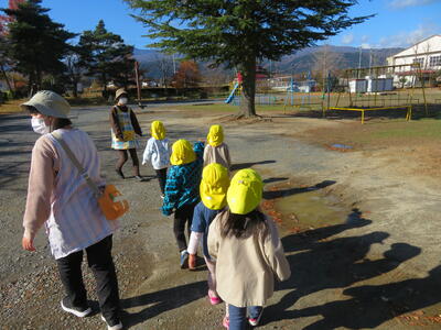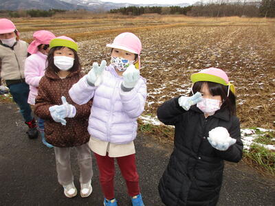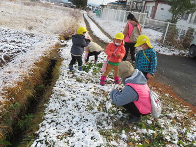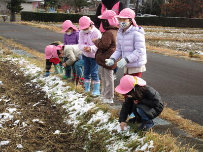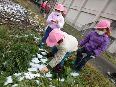 園庭で、雪遊びできるかな・・と思いましたが、残念ながら登園時にはすっかり解けていましたので、年少さんたちは園の周辺に出かけることにしました。