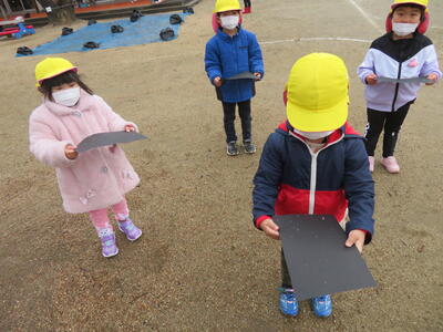 たんぽぽさんたちは、さっそく黒い紙を持って園庭に出ました。何をするのかなと見ていましたら、どうやら雪を黒い紙で取ろうとしているのでした。