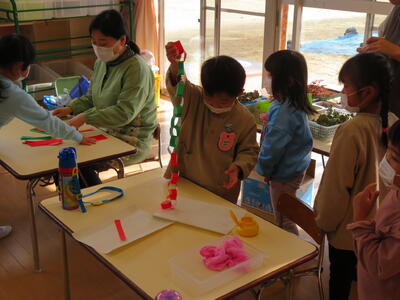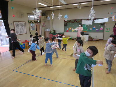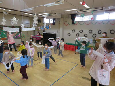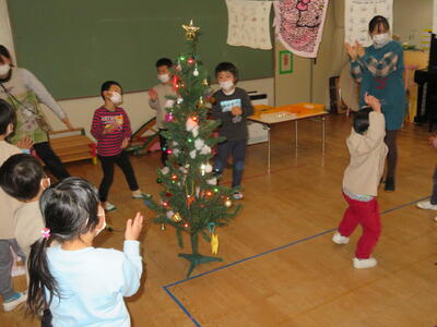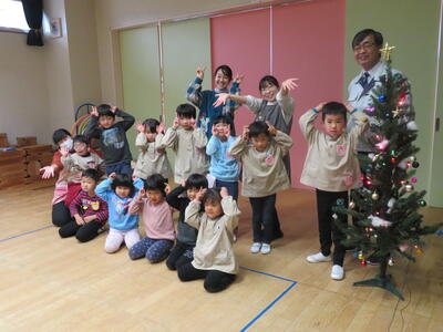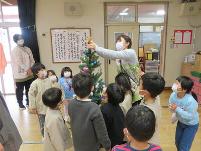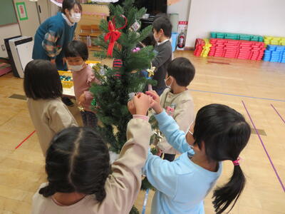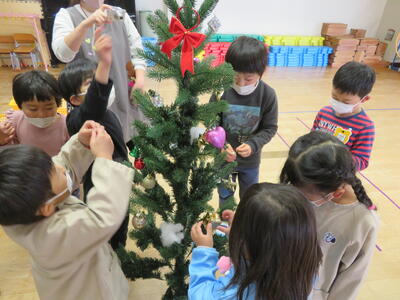 みんなで飾り付けです。年長さんが年少さんに優しく教えてあげながら、きれいに飾りました。