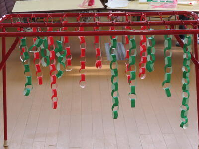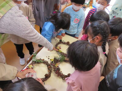 最初に、年長さんが作った輪飾りやクリスマスリースを見せてもらいました。