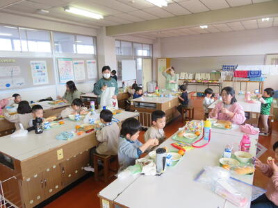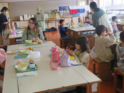 小学校に来ていたALTのステフィー先生も急遽一緒に食べてくれました。
