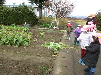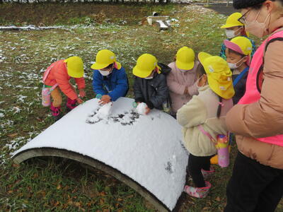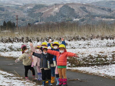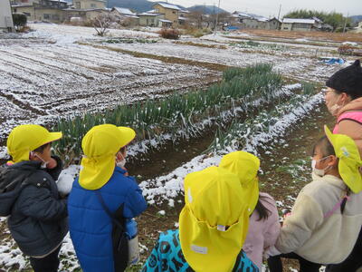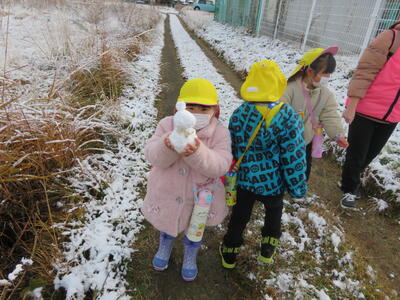 少し歩いては止まりながら雪だるまを作ったり、畑の野菜を観察したり、虫眼鏡で雪の結晶を見たりと、楽しく遊んできました。