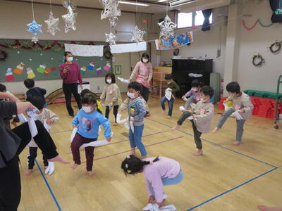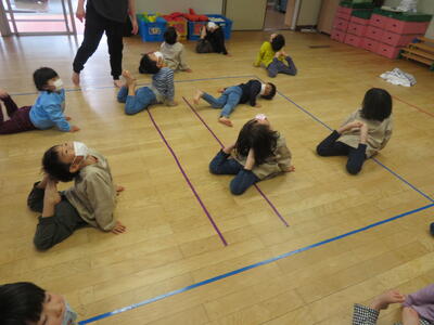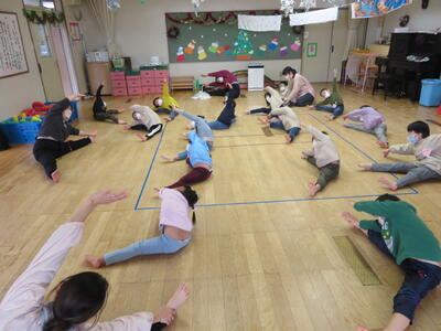 運動不足解消のため、遊戯室で、裸足になってストレッチ体操をしました。