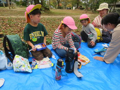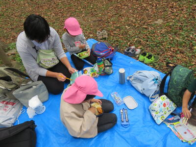 まずはお弁当タイムです。ブルーシートを敷いてみんなで食べました。