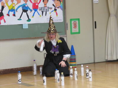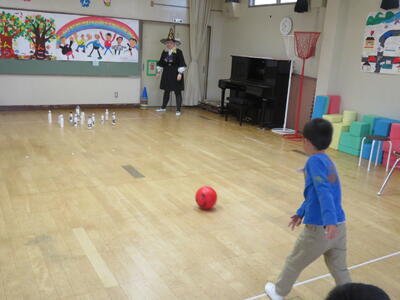 お話の次はゲームです。ボウリングと輪投げをやりました。ボウリングのピンにはステフィがイラストを描いてくれました。