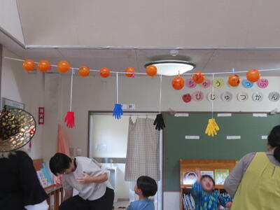 教室でゲームをしました。3種類ありましたがどれも手作りでとってもおもしろかったです。