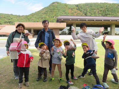 外でも写真を撮った後、次はどんぐり拾いです。驚くほどたくさんのどんぐりが落ちていました。