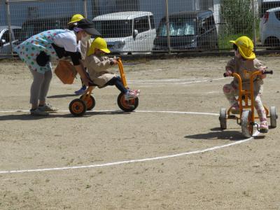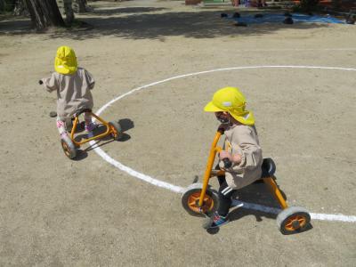 たんぽぽ組さんは、園庭にコースをかいて、三輪車に乗りました。