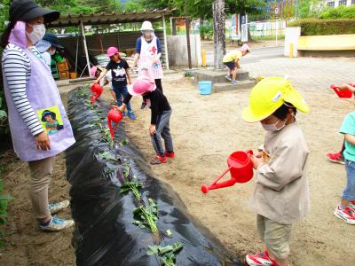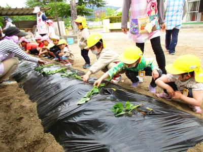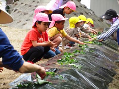 そして今日の朝の時間に、ちゅうりっぷ組さん・たんぽぽ組さん 皆でサツマイモ植えをしました。