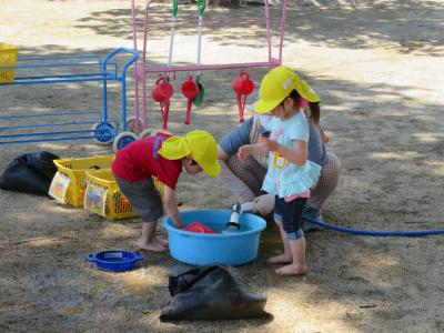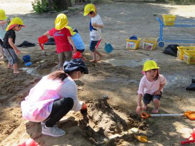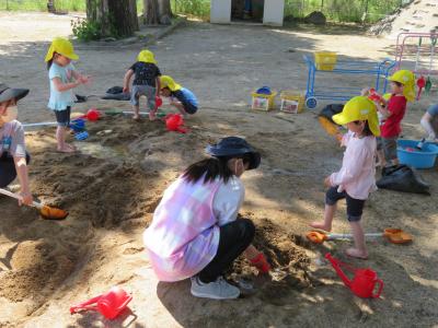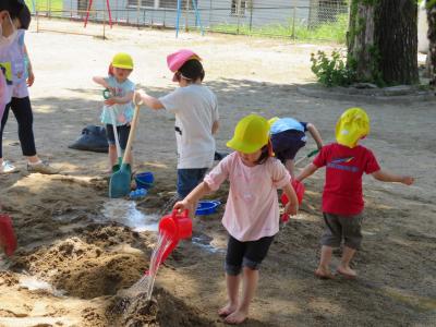 じょうろで水をくみ、池を作って足を入れたり、大きな穴を掘ったり山を作ったりと、みんなで楽しく遊びました。