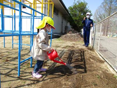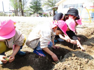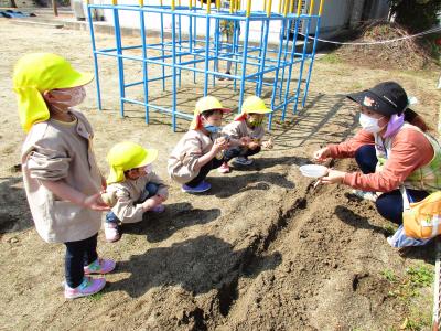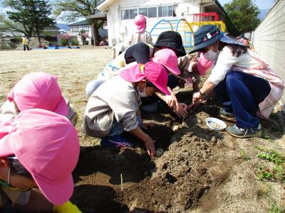 2021年4月20日 10時58分たんぽぽ組さんとちゅうりっぷ組さん全員でジャガイモ植を行いました。