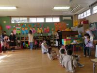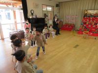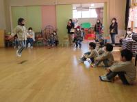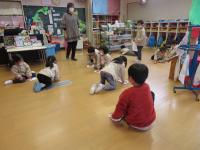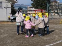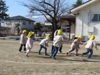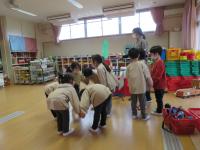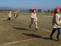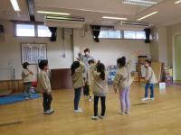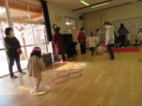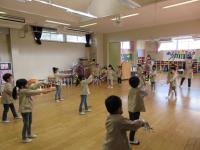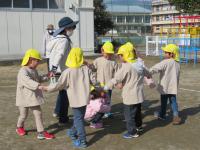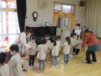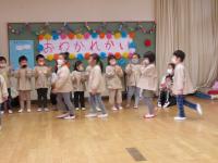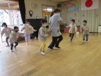 年長(ちゅうりっぷ組)は、園庭で3匹の子ぶたの鬼ごっこをする予定でしたが、風が強くて寒かったため、遊戯室で行いました。子どもたちは、年少時に行ったルールを思い出しながら、所狭しと追いかけたり逃げ回っていました。子どもたちから、もっともっとやりたいという声が上がり、かなりの回数をやり、たいへん満足した様子でした。