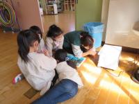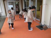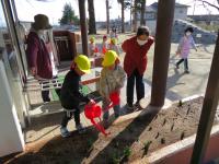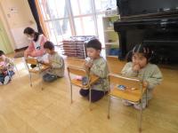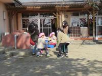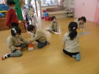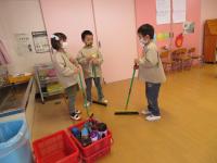 年長(ちゅうりっぷ組)の修了に向けて、年少(たんぽぽ組)に当番の引継ぎを行っています。年長の子どもたちは、年少の子どもたちに保育室やテラスの掃除の仕方やエプロンの畳み方を丁寧に教えながら一緒に活動しました。年少の子どもたちは、日に日に年長になるとういう自覚ができてきて、いろいろなことを進んでやるようになってきました。