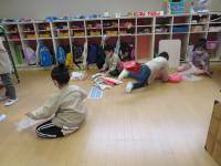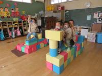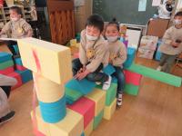 年少(たんぽぽ組)は非常に活発な子どもたちで、外遊びが大好きです。本日外遊びをする予定でしたが、風が強く寒く感じられるため保育室での遊びとなりましたが、女児はお家ごっこでごちそうを作ったり赤ちゃんの世話をしたりして遊びました。男児はソフト積み木で飛行機やスポーツカーを作って操縦したりして遊びました。室内での遊びでしたが、たいへん満足していました。