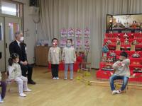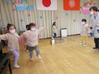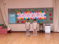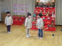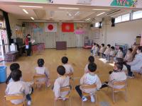年長(ちゅうりっぷ組)、年少(たんぽぽ組)が一緒に、ひな祭り誕生会を開催しました。前回から、司会・運営は年少が行っていますが、2回目となる今回は、落ち着いた様子で年少が進めていました。