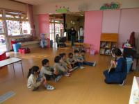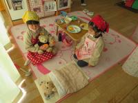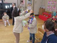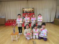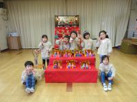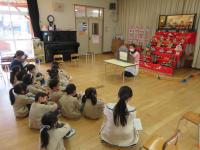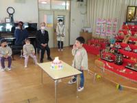 3月生まれの誕生児へ「おめでとう」の歌を歌い、プレゼントを贈りました。また、お楽しみとして、ひな祭り会をし、紙芝居を見たり、歌「うれしいひなまつり」をみんなで歌ったり、ひなあられを食べたりして楽しいひと時を過ごしました。最後に自分たちが制作したひな人形と一緒に、記念撮影をしました。