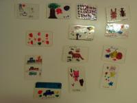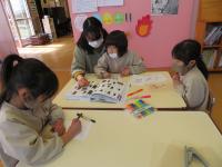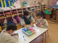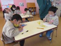 年長(ちゅうりっぷ組)は、お別れ会で年少(たんぽぽ組)の仲良しペアに贈るキーホルダーを作りました。子どもたちは、プラ板に油性ペンで仲良しペアの友達が好きな車や花、カブトムシ、クワガタ、猫などを描き、最後にトースターに入れて熱を加え完成させました。トースターから出てきた作品は、元の8分の1程度に小さくなっていて驚きましたが、素晴らしいものに仕上がり、とても喜んでいました。