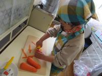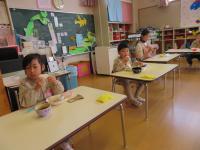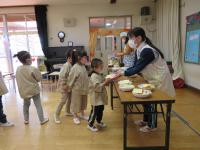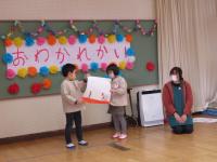 年少(たんぽぽ組)は、年長(ちゅうりっぷ組)に感謝の気持ちを込めてお別れ会を開催しました。年長に招待状を出したり、会場の飾りつけなどを行ったりして準備を進めてきました。お別れ会では、年長から年少への当番活動の引継ぎや仲良しペアによるプレゼント交換を行いました。また、生活発表会で踊ったダンスを一緒に踊り交流を深めました。最後に年少児が人参をピーラーでスライスして作ったコンソメスープ、パン、果物などをみんなで食べて別れを惜しみました。