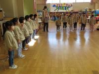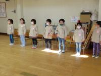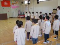 3月19日(金)開催の修了証書授与式の全体練習を始めました。今日は「おわかれのことば」について練習しました。おわかれのことばは、幼児一人一人が呼びかけの形で言葉を発し、その間に合唱をしますが、呼びかけの言葉をしっかりと暗記できており、また合唱も気持ちが籠っていて、学級ごとの頑張って練習してきた成果がよく出ていました。