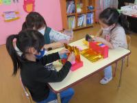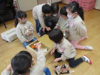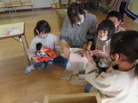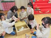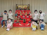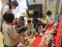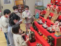 年長(ちゅうりっぷ組)は、遊戯室にひな人形を飾りました。子どもたちは、箱から人形や道具を一つ一つ丁寧に取り出し、説明書を見ながらみんなで協力して飾りました。人形や道具がたくさんあったのですが、手際よく飾ることができました。遊戯室が一気に華やいだ感じになり、春の雰囲気を十分に味わいました。3月3日には、幼稚園全体でひな祭りを行う予定です。
