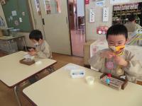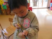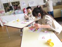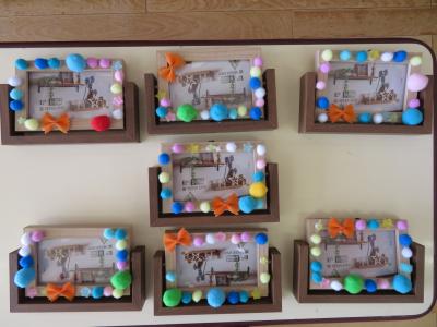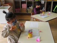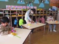 年少(たんぽぽ組)は、3月8日のお別れ会で年長さんへ贈るプレゼント作りに取り組みました。子どもたちは、なかよしペアへの感謝の気持ちを込めて、プレゼントにする写真立ての周りに一つ一つ丁寧に飾りをボンドで貼り付けていました。