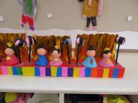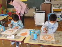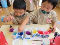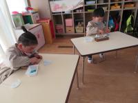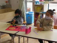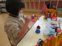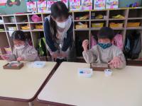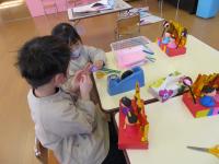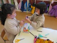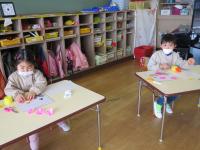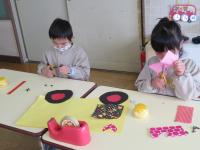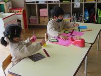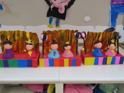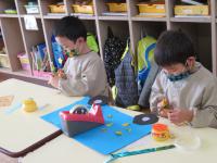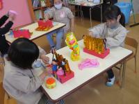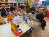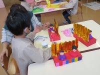 年長(ちゅうりっぷ組)は、ひな祭りに向けて紙粘土でお内裏様とお雛様を作っています。今日はひな人形をのせる土台にいろいろな色の色紙を貼って仕上げを行いました。また、人形に紙粘土で作った烏帽子や冠、笏を付けました。次回は、ぼんぼりを作り、人形の顔を筆で描き入れて完成させる予定です。
