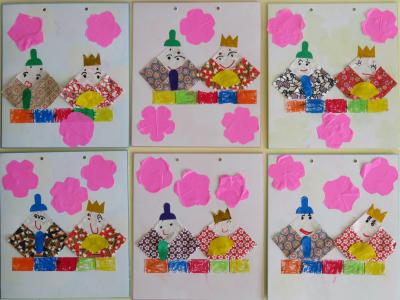 年少(たんぽぽ組)は、3月3日のひな祭りに向けて千代紙でひな人形を作っていましたが、本日できあがりました。子どもたちは、人形に烏帽子、笏(しゃく)、冠、扇を付けたり、桃の花を台紙に貼ったりして完成させました。できあがった作品は、学級に飾ってから家に持ち帰る予定です。