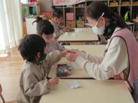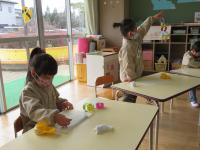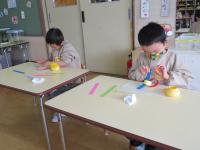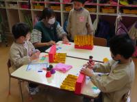 年長(ちゅうりっぷ組)3月3日のひな祭りに向けてひな人形作りに取り組んでいます。本日はぼんぼりを作りました。子どもたちは、作り方を教え合いながら、紙を丸めてセロテープで形を整えてぼんぼりの本体を作り、ストローにビニールテープを巻いた支柱をつけて、土台の両脇に取り付けました。もうすぐ完成です。