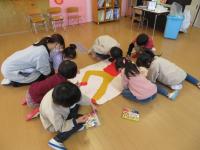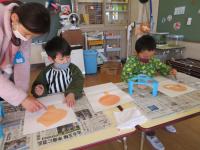 年長(ちゅうりっぷ組)は、3月3日のひな祭り誕生会でプレゼントする誕生児の等身大の絵を描きました。子どもたちは協力して絵具で人物を染め、人物の周囲には誕生児が大好きな車や道路、信号機、標識などを描き入れました。