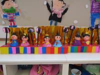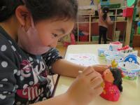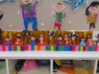 年長(ちゅうりっぷ組)は、3月3日のひな祭りに向けてひな人形作りに取り組んできましたが、本日ついに出来上がりました。子どもたちは、綿棒に絵の具を付けて着物の模様や目、鼻、口などを描き入れました。細かい作業でしたが、気持ちを集中し真剣に取り組みました。出来上がったひな人形は、素晴らしいものばかりで、保育室が一気の華やぎました。