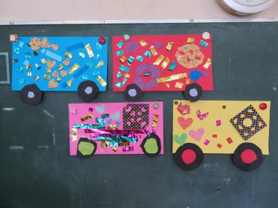 年少(たんぽぽ組)は、3月の壁面制作に取り組んでいます。本日は、二人一組になって汽車の飾りつけを行いました。子どもたちは、色紙、千代紙、テープなどを使って二人で協力しながらデザインを考えて飾っていました。どのような壁面が完成するのか楽しみです。