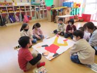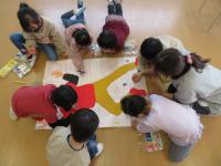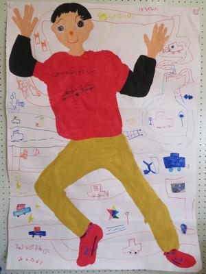 2021年3月1日 17時01分年長(ちゅうりっぷ組)は、3月3日のひな祭り誕生会でプレゼントする誕生児の等身大の絵を描きました。子どもたちは協力して絵具で人物を染め、人物の周囲には誕生児が大好きな車や道路、信号機、標識などを描き入れました。