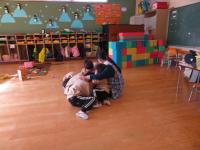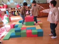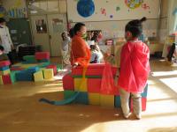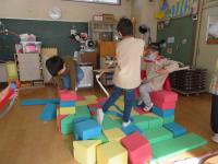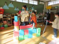 年少(たんぽぽ組)は、みんなで鬼滅の刃ごっこで遊びました。子どもたちは、ソフト積木で無限列車を作って乗ったり、鬼と戦って傷ついて蝶屋敷で治療をしてもらったり思い思いに楽しみました。