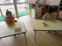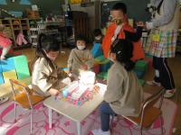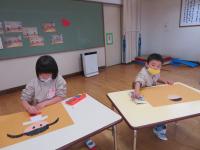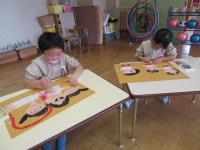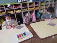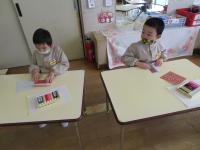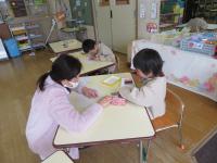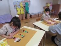 年少(たんぽぽ組)は、ひな祭りに向けて千代紙でひな人形を作りました。子どもたちは、遊戯室に飾ってあるひな人形を見たり、ひな人形に関する絵本の読み聞かせを聞いたりして、ひな人形のイメージを膨らませて制作に入りました。千代紙を折って体を作り、サインペンで目や鼻、口などを描き入れ、とてもかわいい顔のひな人形になりました。これから冠や扇を付け、白い台紙に貼り付けて完成させる予定です。