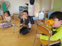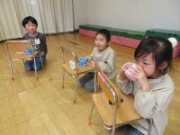 年長(ちゅうりっぷ組)、年少(たんぽぽ組)は、明日2月13日(土)の生活発表会に向けて一生懸命に練習に取り組んできました。これまでの頑張って練習してきたことの慰労を兼ねて、みんなで乳製飲料をいただきました。そして明日の本番では、今まで練習してきた成果を発揮できるように頑張ることを誓い合いました。