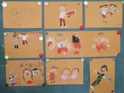 年少(たんぽぽ組)は、楽しく演技ができた生活発表会の絵を描きました。子どもたちは、自分で強く印象に残った演技を積極的に描いていました。全体的に人物を大きく描き楽しかった様子をうまく表現していました。