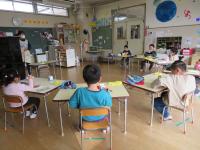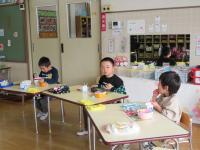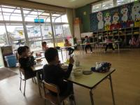 年少(たんぽぽ組)は、新型コロナウイルス感染症拡大防止のため、昼食は一人に1テーブルでみんなの顔が見えるように丸くなり、オルゴールの曲を聴きながら静かに食べています。早く新型コロナウイルス感染症が一日も早く収束し、いろいろと会話を楽しみながらしながら食事ができることを願っています。