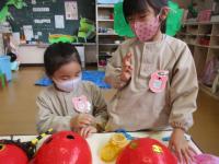 年長(ちゅうりっぷ組)は、節分に向けて張り子の鬼のお面作りを行っています。今日は、お面に赤と青の絵具を塗りました。子どもたちは、色むらがでないように丁寧に塗っていました。今後は、角、髪の毛、鼻、口等をつけて完成させます。どのよう表情の鬼のお面ができるのか楽しみです。