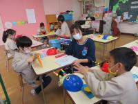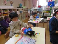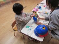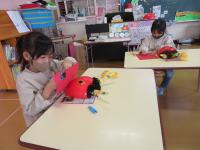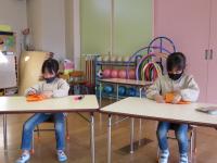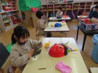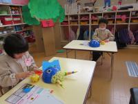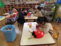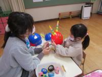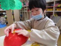 年長(ちゅうりっぷ組)は、節分に向けて張り子の鬼のお面作りに取り組んでいます。今日の作業は、鬼の目や角を作りお面につけました。子どもたちは、目にするための金や銀の色紙を貼りつけたり、黄色い紙を丸めてビニールテープで包み角を作ってお面につけたりしました。だんだんと鬼らしいお面になってきました。完成が楽しみです。