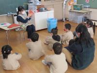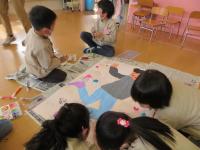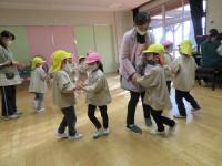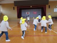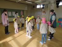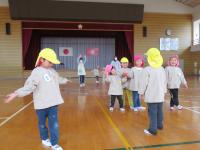 年少(たんぽぽ組)と年長(ちゅうりっぷ組)は、フォークダンスのひとつであるラウンドチェーンを一緒に踊って交流しました。はじめはどのように踊ればよいのか分からず、動きがぎこちなかったですが、慣れるにしたがいじょうずに踊ることができました。一緒に踊る友達がどんどん変わっていくため、変わるたびに「わあ!」と言って楽しんでいました。