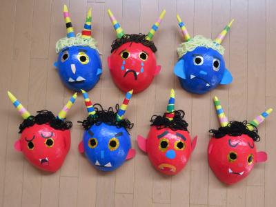 年長(ちゅうりっぷ組)は、先週から節分に向けて張り子の鬼のお面作りに取り組んでいましたが、ついに完成しました。子どもたちは、自分の中にいる鬼をどのように表現するかをいろいろと考え、眉毛や口などの形、大きさをそれぞれに工夫して色画用紙を切って顔に貼り付けました。どのお面も、子どもたちが表現しようとしたことが分かる力作で、幼稚園のレベルを超えたすばらしい物ばかりです。