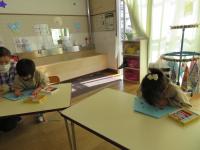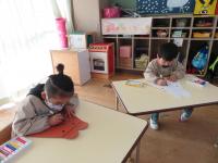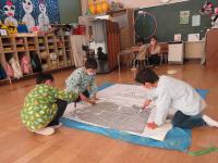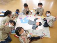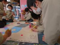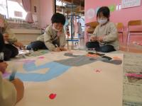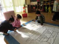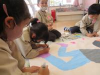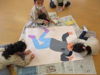 年長(ちゅうりっぷ組)は、みんなで協力して2月生まれの誕生児の等身大の絵を描きました。子どもたちは、誕生児へのお祝いの気持ちを込めて丁寧に描いていました。絵の周りには、本人が好きな猫や犬、花などの絵を描き入れていました。2月2日の誕生会でプレゼントする予定です。