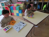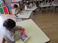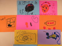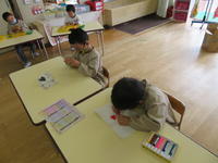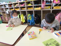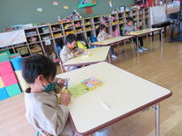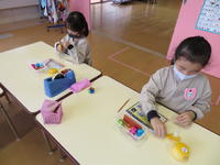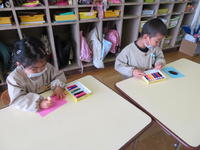 年少(たんぽぽ組)は、壁面を飾るクリスマスツリーに下げるクリスマスプレゼントの絵を描きました。子どもたちは、サンタクロースに願いを込めて、自分の欲しいものを丁寧に描いていました。願いが叶うといいですね。
