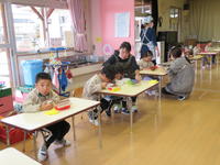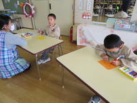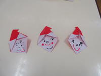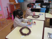年少(たんぽぽ組)は、クリスマスに飾るサンタクロースを折り紙で作りました。子どもたちは、上手に色紙を折って帽子を被ったサンタの頭の部分を作り、マジックで目や鼻、口を描き入れました。たいへんかわいらしい素敵な笑顔のサンタができ、さっそくクリスマスリースに飾り付けました。