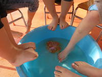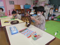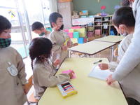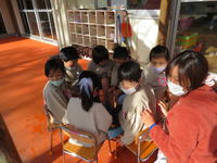 年長(ちゅうりっぷ組)は、先日いただいた宇城みかんの皮を乾燥させて、みかんの足湯を作りました。たんぽぽ組の時に読んだ「もったいないばあさん」の絵本の内容を覚えていたため、みかん風呂が作れることを楽しみにしていました。みんなで温まり楽しいひと時を過ごすことができました。みかんの香りが辺りに漂い、心も体もポッカポカになりたいへん満足していました。