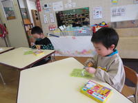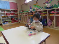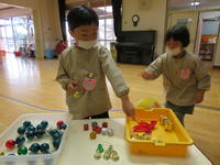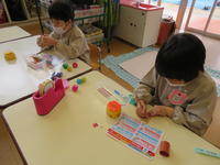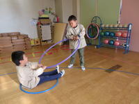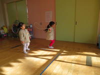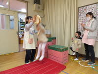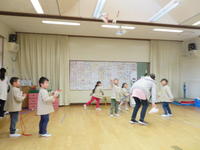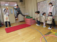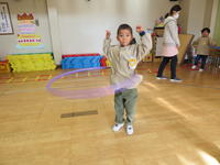 年少(たんぽぽ組)は、遊戯室で好きな遊びを思う存分楽しみました。子どもたちは、巧技台からジャンプして降りたり、フラフープを回したり、縄跳びをしたり、紙飛行機を飛ばしたりとそれぞれに思い思いの遊びに取り組みました。特に、巧技台からのジャンプは、恐怖心が薄らいできており、かなり高く遠くに跳べるようになり成長が感じられました。